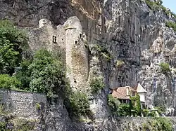 La haute falaise en surplomb de Rochecourbe domine le village et porte sur sa verticale les ruines d'un château des Anglais, dit aussi château du Diable, accroché à une corniche.