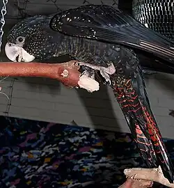 Les oiseaux se reproduisent facilement en captivité[62] et peuvent pondre un œuf toutes les 3 semaines entre février et novembre. Une fois que la femelle a un œuf dans son nid, elle ne pondra plus. Le meilleur moment pour les élever à la main est à environ 10 semaines lorsque les plumes noires sont en place mais que les rectrices sont encore courtes. Les jeunes oiseaux peuvent voler vers 4 mois. Les mâles adultes vont devenir agressifs envers les jeunes peu de temps après l'envol et doivent être séparés s'ils sont élevés en cage[62].