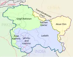Depuis le déclenchement de la première guerre indo-pakistanaise en 1947, le Cachemire est de facto partagé entre l'Inde, le Pakistan et la Chine qui administrent le territoire du Jammu-et-Cachemire et du Ladakh pour l'Inde, les territoires de l'Azad Cachemire et du Gilgit-Baltistan pour le Pakistan ainsi que la région de l'Aksai Chin et la vallée de Shaksgam pour la Chine.