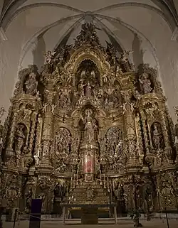 - L'austérité extérieure du bâtiment contraste avec l'intérieur, qui abrite un retable baroque de Pau Costa. Cette œuvre, l'une des plus remarquables de toute la Catalogne, fut achevée par Joan Torras. Il s'agit d'une pièce spectaculaire, en bois doré et à l'iconographie énergique. Les éléments ornementaux, atlantes, motifs végétaux et gracieux angelots, ont été réalisés avec une minutie admirable.