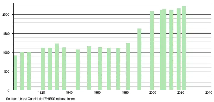 L'évolution du nombre d'habitants est connue à travers les recensements de la population effectués dans la commune depuis 1901. Pour les communes de moins de 10 000 habitants, une enquête de recensement portant sur toute la population est réalisée tous les cinq ans, les populations de référence des années intermédiaires étant quant à elles estimées par interpolation ou extrapolation[16]. Pour la commune, le premier recensement exhaustif entrant dans le cadre du nouveau dispositif a été réalisé en 2008[17].