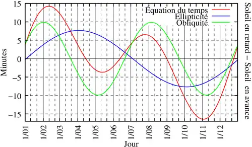 - le jour solaire n'est pas rigoureusement constant suivant les saisons : cette variation est traduite par l'équation du temps ;