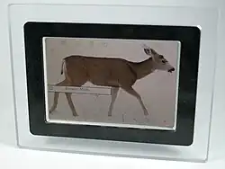 La dalle, de finition mate ou brillante, d'une diagonale de 7 pouces (~ 17 cm) à 15 pouces (~ 38 cm) en général, est au format 4/3[1] (la définition de la dalle peut atteindre 1024 x 768 pixels), 16/9 ou parfois 15/9. Si l'écran n'a pas un format homothétique à la photo (de même rapport que la photo), il risque de l'afficher déformée ou avec des bandes noires.
