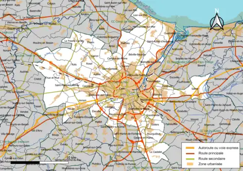 Située dans le département du Calvados, la communauté urbaine Caen la Mer regroupe 48 communes et s'étend sur 362,9 km2[12]. Le pôle urbain de la communauté, qui regroupe environ 57 % de la population de l'intercommunalité, est constitué par les villes de Caen (près de 40 % de la population de Caen la mer), Hérouville-Saint-Clair, Ifs, Mondeville et Colombelles, marqué par la présence de plusieurs quartiers prioritaires au sens de la politique de la ville[13].