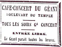 - ↑ Ordonnance de police du 17 novembre 1849 (extrait) : ...il est interdit aux propriétaires des Cafés et autres établissements publics situés dans le ressort de la Préfecture de Police, de recevoir dans leur établissement des chanteurs, bateleurs et musiciens, et d’y faire exécuter des chants, déclamations, parades et concerts sans en avoir obtenu l’autorisation.