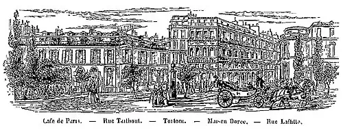 Sur le coup de midi, arrivent [aussi] « les dandies [sic] : ils entrent à Tortoni par la porte de derrière [rue Taitbout], attendu que le perron est envahi par […] les gens de la Bourse. Le monde dandy, rasé et coiffé, déjeune jusqu'à deux heures, à grand bruit, puis s'envole[22]… »
