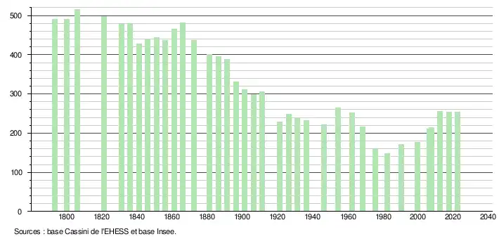 L'évolution du nombre d'habitants est connue à travers les recensements de la population effectués dans la commune depuis 1793. Pour les communes de moins de 10 000 habitants, une enquête de recensement portant sur toute la population est réalisée tous les cinq ans, les populations de référence des années intermédiaires étant quant à elles estimées par interpolation ou extrapolation[25]. Pour la commune, le premier recensement exhaustif entrant dans le cadre du nouveau dispositif a été réalisé en 2007[26].