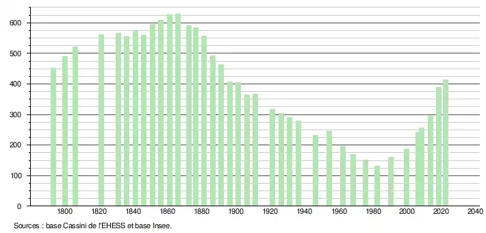 L'évolution du nombre d'habitants est connue à travers les recensements de la population effectués dans la commune depuis 1793. Pour les communes de moins de 10 000 habitants, une enquête de recensement portant sur toute la population est réalisée tous les cinq ans, les populations de référence des années intermédiaires étant quant à elles estimées par interpolation ou extrapolation[30]. Pour la commune, le premier recensement exhaustif entrant dans le cadre du nouveau dispositif a été réalisé en 2008[31].