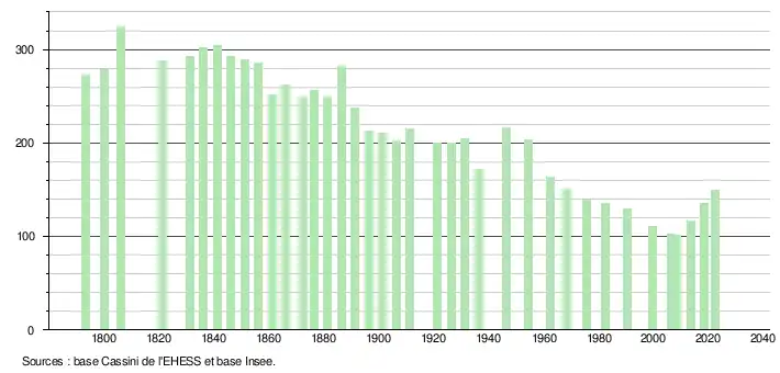 L'évolution du nombre d'habitants est connue à travers les recensements de la population effectués dans la commune depuis 1793. Pour les communes de moins de 10 000 habitants, une enquête de recensement portant sur toute la population est réalisée tous les cinq ans, les populations de référence des années intermédiaires étant quant à elles estimées par interpolation ou extrapolation[24]. Pour la commune, le premier recensement exhaustif entrant dans le cadre du nouveau dispositif a été réalisé en 2008[25].