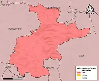 Le retrait-gonflement des sols argileux est susceptible d'engendrer des dommages importants aux bâtiments en cas d’alternance de périodes de sécheresse et de pluie. La totalité de la commune est en aléa moyen ou fort (94,5 % au niveau départemental et 48,5 % au niveau national). Sur les 104 bâtiments dénombrés sur la commune en 2019, 104 sont en aléa moyen ou fort, soit 100 %, à comparer aux 93 % au niveau départemental et 54 % au niveau national. Une cartographie de l'exposition du territoire national au retrait gonflement des sols argileux est disponible sur le site du BRGM[18],[Carte 3].