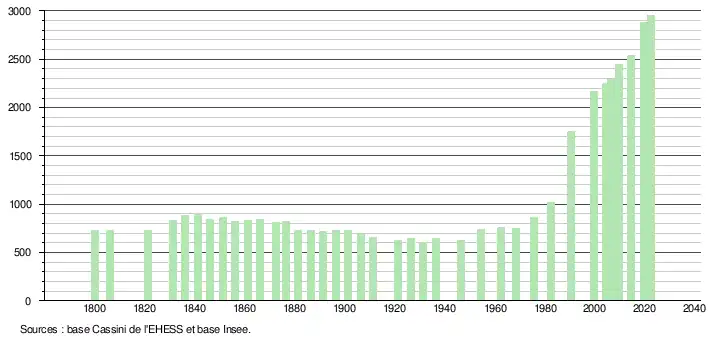 L'évolution du nombre d'habitants est connue à travers les recensements de la population effectués dans la commune depuis 1800. Pour les communes de moins de 10 000 habitants, une enquête de recensement portant sur toute la population est réalisée tous les cinq ans, les populations de référence des années intermédiaires étant quant à elles estimées par interpolation ou extrapolation[20]. Pour la commune, le premier recensement exhaustif entrant dans le cadre du nouveau dispositif a été réalisé en 2004[21].