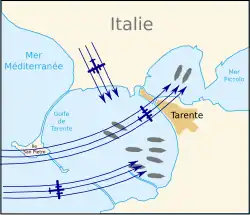 Dans la nuit du 11 au , vingt et un Fairey Swordfish du porte-avions Illustrious de la Mediterranean Fleet attaquèrent la flotte italienne basée à Tarente en deux vagues. Si l'Andrea Doria sortit indemne, le Caio Duilio eut moins de chance. Une torpille lancé à 400 mètres toucha le navire à proximité de la soute à munitions avant, créant une brèche de 11 mètres sur 7[1]. Le navire coula par petit fond et le , le cuirassé quitta Tarente pour des réparations à Gênes, entrant au bassin le . Il y restera jusqu'à la fin du mois d'avril 1941, retournant de la baie de Tarente en mai 1941.