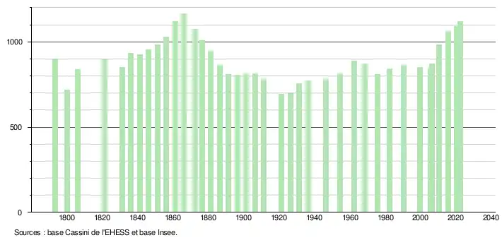 L'évolution du nombre d'habitants est connue à travers les recensements de la population effectués dans la commune depuis 1793. Pour les communes de moins de 10 000 habitants, une enquête de recensement portant sur toute la population est réalisée tous les cinq ans, les populations de référence des années intermédiaires étant quant à elles estimées par interpolation ou extrapolation[22]. Pour la commune, le premier recensement exhaustif entrant dans le cadre du nouveau dispositif a été réalisé en 2005[23].