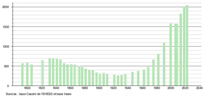 L'évolution du nombre d'habitants est connue à travers les recensements de la population effectués dans la commune depuis 1793. Pour les communes de moins de 10 000 habitants, une enquête de recensement portant sur toute la population est réalisée tous les cinq ans, les populations de référence des années intermédiaires étant quant à elles estimées par interpolation ou extrapolation[26]. Pour la commune, le premier recensement exhaustif entrant dans le cadre du nouveau dispositif a été réalisé en 2008[27].