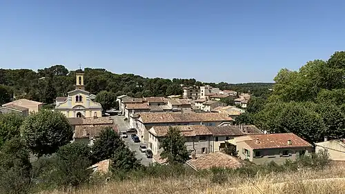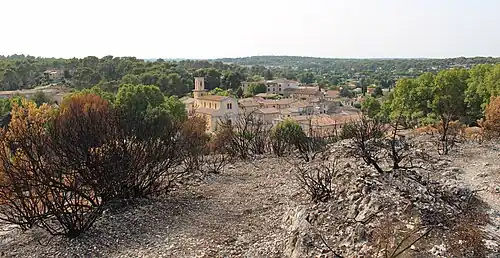Le village et Notre-Dame-de-la-Salette sur la colline de Trébillane. | |