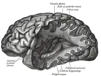Le terme latin calcar avis (en français littéralement : ergot d'oiseau) désigne une éminence de forme allongée située sur la paroi médiale de la corne postérieure du ventricule latéral. Cette formation est encore appelée hippocampus minor, c'est-à-dire petit hipopocampe ou ergot de Morand, du nom de son découvreur et correspond à l'involution de cette partie de la paroi ventriculaire due au développement de la scissure calcarine du lobe occipital. La description du calcar avis fut donnée pour la première fois par le chirurgien et anatomiste Sauveur-François Morand (1697-1773)[1]: ce dernier « fait part à l'Académie des Sciences, en 1744, de sa découverte d'un relief en cône de coloration blanche qu'il compare à un ergot. Située au-dessous du bulbe, occupant la totalité de la région antéro-postérieure de la corne occipitale, la face externe convexe de l'ergot de Morand bombe dans la cavité du ventricule latéral ».