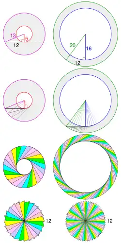 Avec les données de la figure ci-contre, l'aire de la couronne vaut ; mais par le théorème de Mamikon, elle vaut ; on en déduit bien .