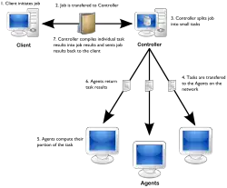 En règle générale, un programme s'exécutant sur l'ordinateur d'un volontaire contacte périodiquement une application de recherche pour demander des travaux et rapporter les résultats. Un système middleware peut également servir d'intermédiaire – comme, par exemple, l'application BOINC.