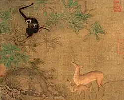 - Sānyuán : au XIe siècle sous la dynastie Song du Nord, les hommes qui terminaient premiers aux trois niveaux des Examens impériaux étaient honorés du titre de « Sanyuan » (三元), signifiant simplement « les Trois premiers ». À la suite de l'apparition de ce terme dans la littérature chinoise, les représentations de trois gibbons poursuivant trois aigrettes apparurent dans la peinture chinoise. En chinois, cette scène pourrait être décrite par « 三猿得鹭 » (san yuan de lu), un calembour sur « 三元得路 » signifiant « un des trois premiers prend du pouvoir ». Rapidement, le gibbon devint un symbole plus général, désignant quelqu'un ayant réussi les examens impériaux, y compris au-delà des premiers rangs. Dès lors, l'image témoigna du vœu que le participant réussisse. Plus tard, les aigrettes furent parfois remplacées par un cerf. En mandarin, le mot « 鹿 » (lù), signifiant « cerf », est homophone de « 鹭 » (lù), signifiant « aigrette », avec un calembour équivalent[18].