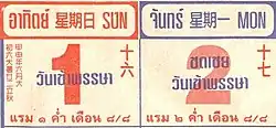 Tandis que le calendrier solaire des jours de la semaine ont des noms, les jours du calendrier lunaire sont numérotés séquentiellement de 1 à 14 ou 15 en deux segments selon que la Lune est croissante ou décroissante. Par exemple, " raem 15 kham duean 12, แรม ๑๕ ค่ำ เดือน ๑๒" signifie " Déclin de la 15e nuit du 12e mois lunaire".