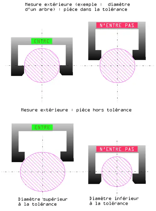 Le principe du contrôle d'une grandeur mécanique par calibre à limite est basé sur l'utilisation d'un calibre ENTRE et d'un calibre N'ENTRE PAS parfois appelés GO et NO GO. Ce contrôle ne donne pas de renseignement sur la valeur de la grandeur. En revanche, il renseigne sur le fait que la grandeur mesurée est dans la tolérance spécifiée et nécessaire pour assurer le fonctionnement d'un ensemble mécanique.