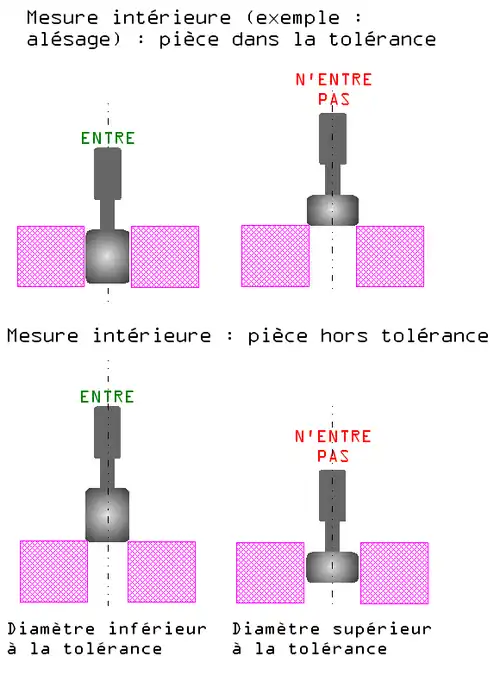 C'est donc en principe un contrôle de fabrication ou même de réception mais ce n'est pas une mesure. Les calibres à limite ne sont pas des appareils mesureurs (comme un pied à coulisse par exemple). Son avantage réside dans la simplicité et la rapidité du contrôle. Elle permet un tri des pièces mais elle ne permettra pas de faire un diagnostic sur une éventuelle non-conformité.