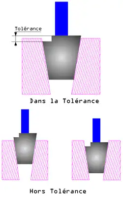 Le contrôle d'un filetage conique par calibre à limite n'est pas effectué par des tampons ENTRE et N'ENTRE PAS mais à l'aide de calibres dont la tolérance est matérialisée par une encoche située sur le haut du calibre (tampon pour filetage intérieur et bague pour filetage extérieur). Le calibre contrôle dans ce cas une pénétration. Pour être conforme, la face supérieure du filetage ne doit pas être en dessous ou au-dessus des deux plans représentés par l'encoche.