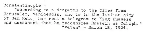 « وعقب إلغاء الخلافة العثمانية من تركيا في ٤ آذار، أعاد الحجاز توضيح موقف الحسين من الخلافة القائمة على عدم انتحاله لهذا المنصب ما دامت الخلافة العثمانية، وكان الحسين مؤمنًا بوحدة الأمة الإسلامية حتى ألغتها الأتراك. »