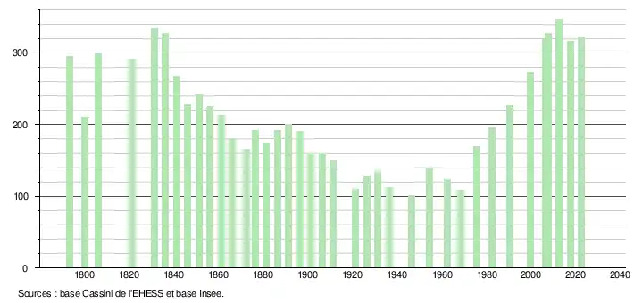L'évolution du nombre d'habitants est connue à travers les recensements de la population effectués dans la commune depuis 1793. Pour les communes de moins de 10 000 habitants, une enquête de recensement portant sur toute la population est réalisée tous les cinq ans, les populations de référence des années intermédiaires étant quant à elles estimées par interpolation ou extrapolation[15]. Pour la commune, le premier recensement exhaustif entrant dans le cadre du nouveau dispositif a été réalisé en 2007[16].