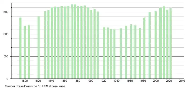 L'évolution du nombre d'habitants est connue à travers les recensements de la population effectués dans la commune depuis 1793. Pour les communes de moins de 10 000 habitants, une enquête de recensement portant sur toute la population est réalisée tous les cinq ans, les populations de référence des années intermédiaires étant quant à elles estimées par interpolation ou extrapolation[40]. Pour la commune, le premier recensement exhaustif entrant dans le cadre du nouveau dispositif a été réalisé en 2007[41].