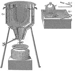 - ↑ La chambre principale (avec son panier central) et la couche externe creuse sont remplies de glace pilée pour isoler l'appareil et limiter l'apport en chaleur de l'air de l'extérieur. « Une once de charbon puis un cochon d’Inde sont placés dans le panier central, lui-même entouré de glace pilée. Les robinets permettent de récupérer la glace fondue au terme de chaque expérience, et mesurer ainsi la chaleur produite dans les deux cas. À droite, la cloche utilisée pour mesurer les proportions d’ « air vital » transformées en « air fixe » par la combustion d’une once de charbon et par la respiration d’un cochon d’Inde dix heures durant ». Cf Barthélemy Durrive, « De la chaleur (animale) au travail (humain) : une certaine idée de l’activité corporelle mesurée au calorimètre (1780-1901) », e-Phaïstos. Revue d’histoire des techniques, vol. III, no 1, (DOI 10.4000/ephaistos.4599).