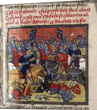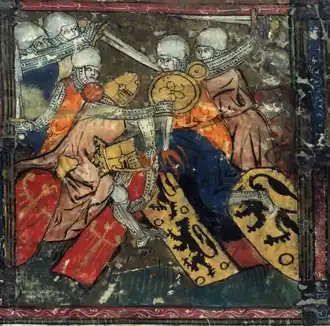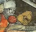 | Sceau de Guy de Laval en 1095. Il porte un "haubert" de broigne "demie clour" avec camail intégré | Contre-sceau de Louis VII le Jeune en 1041. Il porte un haubert avec camail intégré | Sceau de Richard Cœur de Lion en 1195. Il porte un haubert avec camail intégré | Statue de saint Maurice, cathédrale de Magdebourg (Allemagne), milieu du XIIIe siècle. |