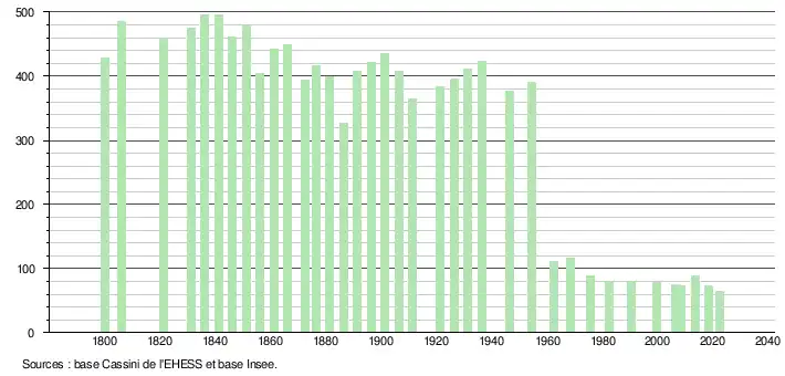 L'évolution du nombre d'habitants est connue à travers les recensements de la population effectués dans la commune depuis 1800. Pour les communes de moins de 10 000 habitants, une enquête de recensement portant sur toute la population est réalisée tous les cinq ans, les populations de référence des années intermédiaires étant quant à elles estimées par interpolation ou extrapolation[12]. Pour la commune, le premier recensement exhaustif entrant dans le cadre du nouveau dispositif a été réalisé en 2008[13].