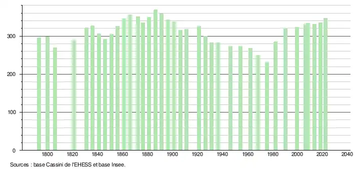 L'évolution du nombre d'habitants est connue à travers les recensements de la population effectués dans la commune depuis 1793. Pour les communes de moins de 10 000 habitants, une enquête de recensement portant sur toute la population est réalisée tous les cinq ans, les populations de référence des années intermédiaires étant quant à elles estimées par interpolation ou extrapolation[28]. Pour la commune, le premier recensement exhaustif entrant dans le cadre du nouveau dispositif a été réalisé en 2008[29].