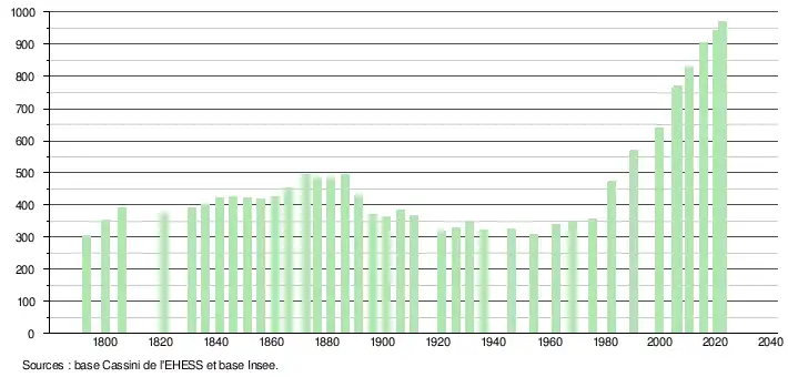 | L'évolution du nombre d'habitants est connue à travers les recensements de la population effectués dans la commune depuis 1793. Pour les communes de moins de 10 000 habitants, une enquête de recensement portant sur toute la population est réalisée tous les cinq ans, les populations de référence des années intermédiaires étant quant à elles estimées par interpolation ou extrapolation[31]. Pour la commune, le premier recensement exhaustif entrant dans le cadre du nouveau dispositif a été réalisé en 2005[32]. En 2022, la commune comptait 972 habitants[Note 8], en évolution de +5,54 % par rapport à 2016 (Tarn : +2,52 %, France hors Mayotte : +2,11 %). |