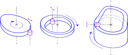 - came cylindrique, came cloche, came à tambour, came à transmission axiale : la came est en rotation par rapport au support du suiveur, et l'effort est parallèle à l'axe ;