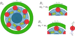 Dans une roue libre à rouleaux, la partie centrale est une came sur laquelle roule le rouleau coinceur. Dans le référentiel, le système se verrouille lorsque le pignon de la roue arrière tourne dans le sens de l'avancement de la bicyclette, c'est-à-dire que l'axe-came, la pièce, bleue tourne dans le sens horaire sur le schéma ci-contre. Plaçons nous maintenant dans le référentiel du pignon, donc de l'axe-came ; le moyeu (pièce en vert dans la figure ci-contre) tourne dans le sens anti-horaire et entraîne les rouleaux (en rouge) par frottement. Le rouleau roule sur la came et se rapproche du moyeu, ce qui crée un coincement par arc-boutement et donc un verrouillage de la liaison.