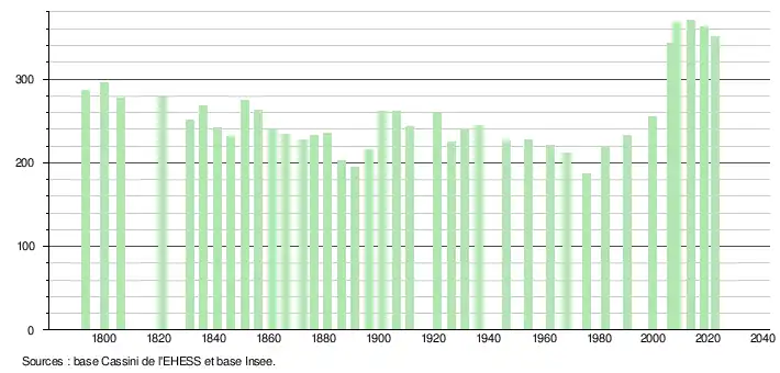 L'évolution du nombre d'habitants est connue à travers les recensements de la population effectués dans la commune depuis 1793. Pour les communes de moins de 10 000 habitants, une enquête de recensement portant sur toute la population est réalisée tous les cinq ans, les populations de référence des années intermédiaires étant quant à elles estimées par interpolation ou extrapolation[28]. Pour la commune, le premier recensement exhaustif entrant dans le cadre du nouveau dispositif a été réalisé en 2008[29].