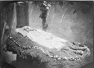 Francis Trochu, auteur en 1925 d'une biographie du curé d'Ars[9], écrit à son sujet : « Le défilé des visiteurs ne s'est arrêté que pendant une demi-heure de l'après midi du . Alors que le soleil était le plus ardent, on sortit le corps sur son lit d'honneur orné de fleurs et de feuillages et pour la première fois, un photographe réussit à prendre les traits du curé d'Ars. Il y eut trois photographies différentes de prises. »
