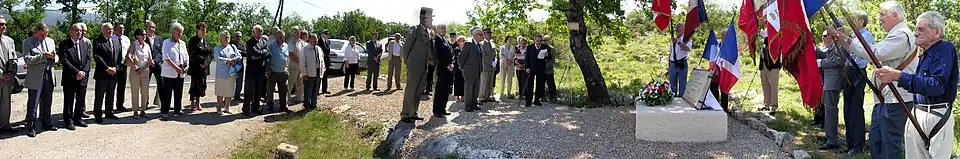 | Cérémonie annuelle du Clos d'Espargon (Camp de Canjuers). | La stèle avant son déplacement. | Le drapeau du SAP camp Lafayette. |