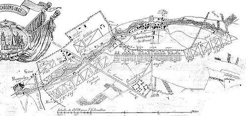 Une ligne de chemin de fer de Châlons à Mourmelon-le-Petit est créée pour desservir le camp, sa mise en service a lieu le 14 octobre 1857[8]. En gare de Châlons-en-Champagne elle s'embranche sur la ligne de Paris à Strasbourg et aboutit à la gare de Mourmelon-le-Petit prévue pour les embarquements et les débarquements nécessaires aux militaires.