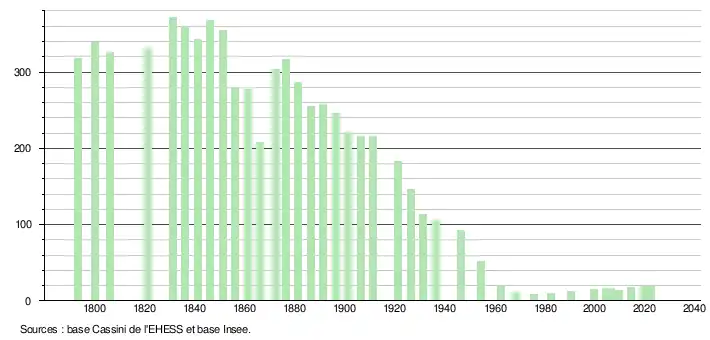 | L'évolution du nombre d'habitants est connue à travers les recensements de la population effectués dans la commune depuis 1793. Pour les communes de moins de 10 000 habitants, une enquête de recensement portant sur toute la population est réalisée tous les cinq ans, les populations de référence des années intermédiaires étant quant à elles estimées par interpolation ou extrapolation[36]. Pour la commune, le premier recensement exhaustif entrant dans le cadre du nouveau dispositif a été réalisé en 2004[37]. En 2022, la commune comptait 19 habitants[Note 5], en évolution de +5,56 % par rapport à 2016 (Aude : +2,65 %, France hors Mayotte : +2,11 %). |