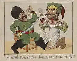 - ↑ Il avait introduit dans son armée un maniement d'armes particulier : lorsque l'officier commandait marche aux Turcs, les soldats portaient la baïonnette en avant ; à l'ordre marche aux Prussiens, le mouvement était accéléré et la baïonnette croisée deux fois ; mais aux mots marche aux Français, le soldat devait s'élancer avec impétuosité, réitérer par trois fois l'action de la baïonnette, l'enfoncer dans la terre, qui figurait alors les Français abattus, et la retourner avec force. Selon quelques-uns des biographes, Souvorov avait défendu d'enseigner aux troupes les manœuvres relatives aux retraites, soutenant qu'elles n'en auraient jamais besoin ; assertion bizarre, les manœuvres en arrière étant parfois aussi urgentes que celles en avant, en bataille, ou par le flanc et si une pareille injonction a jamais été donnée, ce qui est peu probable, les généraux français, et Masséna à leur tête, ont dû convaincre Souvorov de son absurdité.