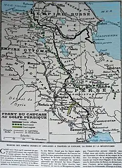 Pendant les derniers mois de la guerre, alors que la Russie, en pleine révolution bolchevique, n'est plus en état de défendre le Caucase, l'armée britannique de Lionel Dunsterville traverse la Perse, en contournant Tabriz et d'autres villes tenues par les Ottomans, pour tenter d'empêcher les Allemands et les Ottomans de s'emparer du pétole de Bakou. Défaite à la bataille de Bakou, elle doit évacuer l'Azerbaïdjan le [1].