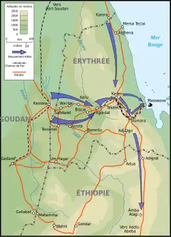 Menée dès le , la campagne dans l'Est de l'Afrique aboutit à la fin de l'année 1941 à la défaite des italiens sous les coups des Anglais, au nord, et des Belges au sud avec pour conséquence le démantèlement de l'Afrique orientale italienne. L'occupation italienne de l'Éthiopie prend fin en et l'empire d'Éthiopie est restauré, le Négus remontant sur le trône à Addis-Abeba.