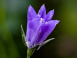 Elle est glabre, luisante et possède une robuste tige droite jusqu'en haut qui porte une grappe de deux à six grandes fleurs bleu clair ou blanc largement ouvertes et inclinées vers le haut, à calice à longs et étroits sépales, à corolle bleue en cloche à cinq lobes peu profonds, contenant un pistil à trois stigmates[6]. La corolle est longue de 25 à 40 mm[7].