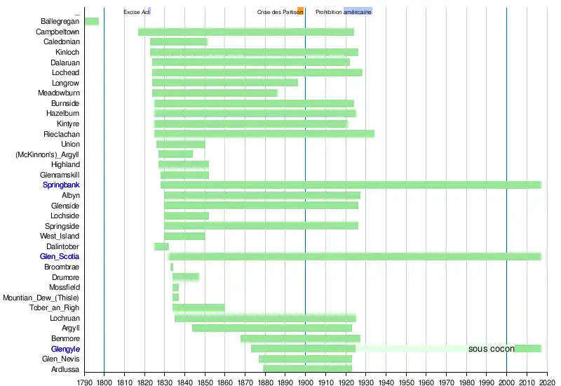 Campbeltown a été un des principaux centres de production de whisky d'Écosse. La ville est au cœur de l’appellation « whisky de Campbeltown ». La ville et sa région ont compté jusqu’à 34 distilleries au début du XXe siècle. Elle s’était même autoproclamée « La capitale mondiale du whisky ». L’économie du whisky dans la région a connu une grande dégringolade dans les années 1930 où quasiment toutes les distilleries ont fermé leurs portes les unes après les autres à la suite de l’action combinée de la prohibition et de la Grande Dépression américaine, ainsi que d’une stratégie qui s’est avérée suicidaire en privilégiant les quantités de whisky produites, plutôt que sa qualité.