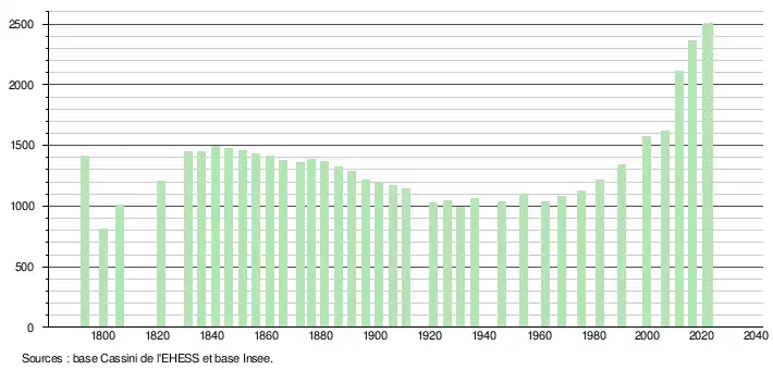 L'évolution du nombre d'habitants est connue à travers les recensements de la population effectués dans la commune depuis 1793. Pour les communes de moins de 10 000 habitants, une enquête de recensement portant sur toute la population est réalisée tous les cinq ans, les populations de référence des années intermédiaires étant quant à elles estimées par interpolation ou extrapolation[18]. Pour la commune, le premier recensement exhaustif entrant dans le cadre du nouveau dispositif a été réalisé en 2006[19].