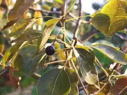 C'est un arbre de taille moyenne, de 15 à 25 m de haut, à feuilles alternes, entières, coriaces et persistantes, pouvant présenter des domaties. De forme générale ovale, elles sont longues de 10 cm environ et dégagent une forte odeur de camphre au froissement. Portées par un pédoncule vert épais, les fruits sont des drupes charnues sphériques, bleu sombre à noires à maturité.