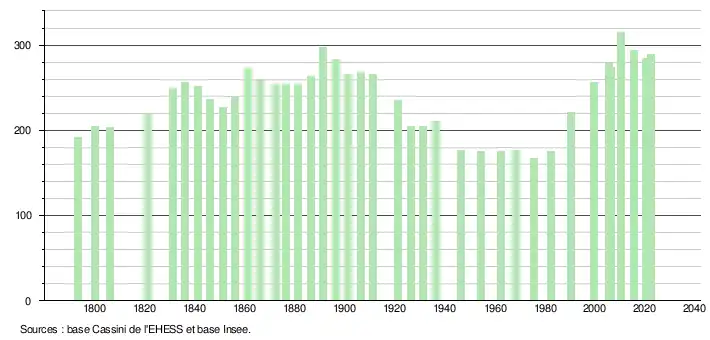 L'évolution du nombre d'habitants est connue à travers les recensements de la population effectués dans la commune depuis 1793. Pour les communes de moins de 10 000 habitants, une enquête de recensement portant sur toute la population est réalisée tous les cinq ans, les populations de référence des années intermédiaires étant quant à elles estimées par interpolation ou extrapolation[29]. Pour la commune, le premier recensement exhaustif entrant dans le cadre du nouveau dispositif a été réalisé en 2005[30].